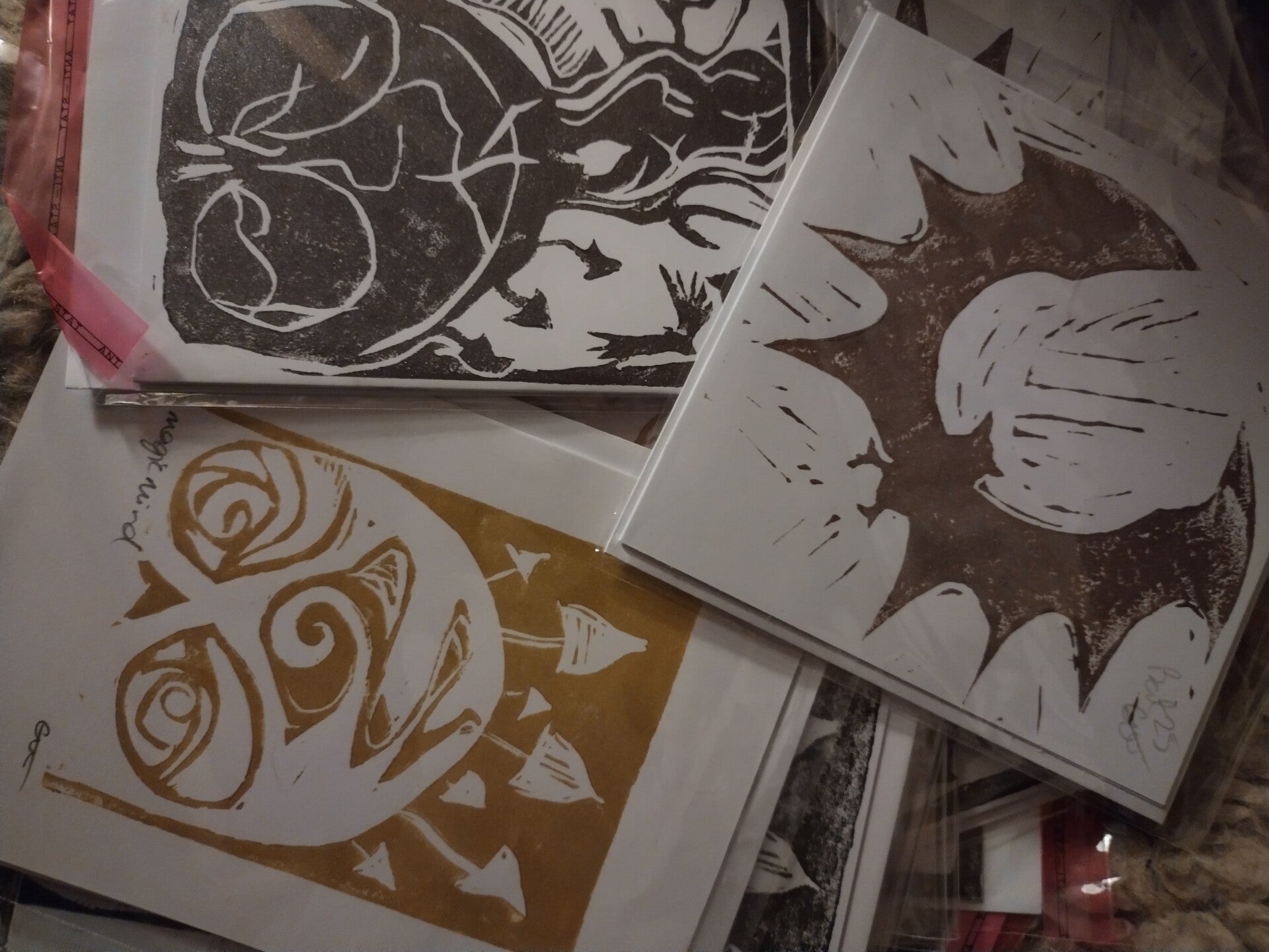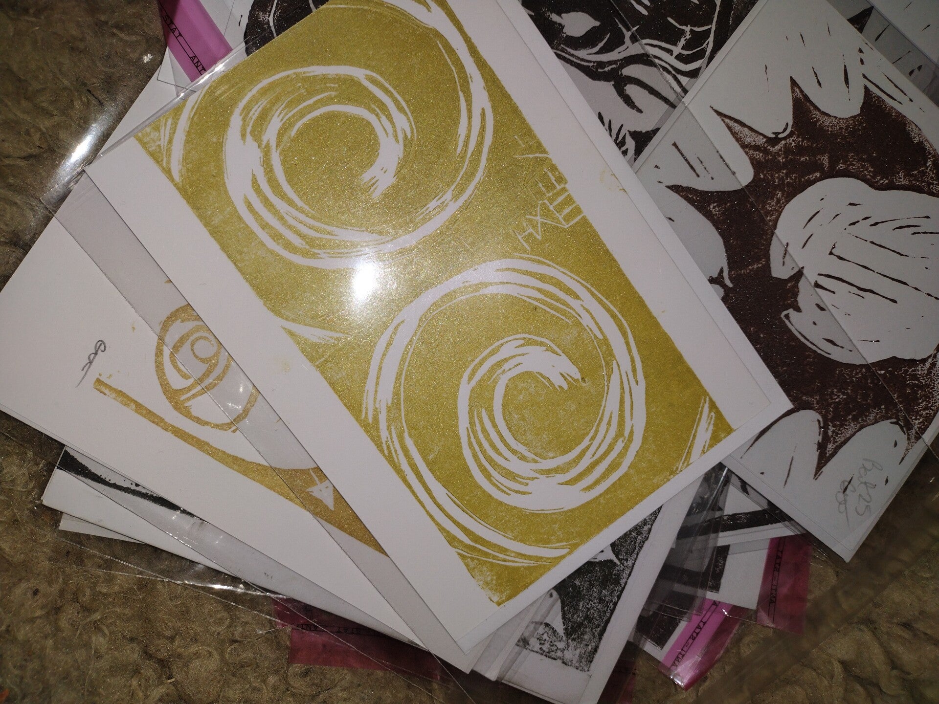 The creation of each lino print is a physical, full-body, many faceted process that I absolutely love – especially the satisfying act of stamping. While I craft these into beautiful cards, keeping track of envelopes can be a challenge! A crucial detail in our process is individually wrapping each printed card in cellophane; this prevents the glue from getting damp and ensures the envelopes remain perfectly functional.